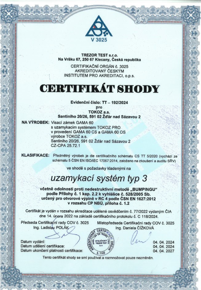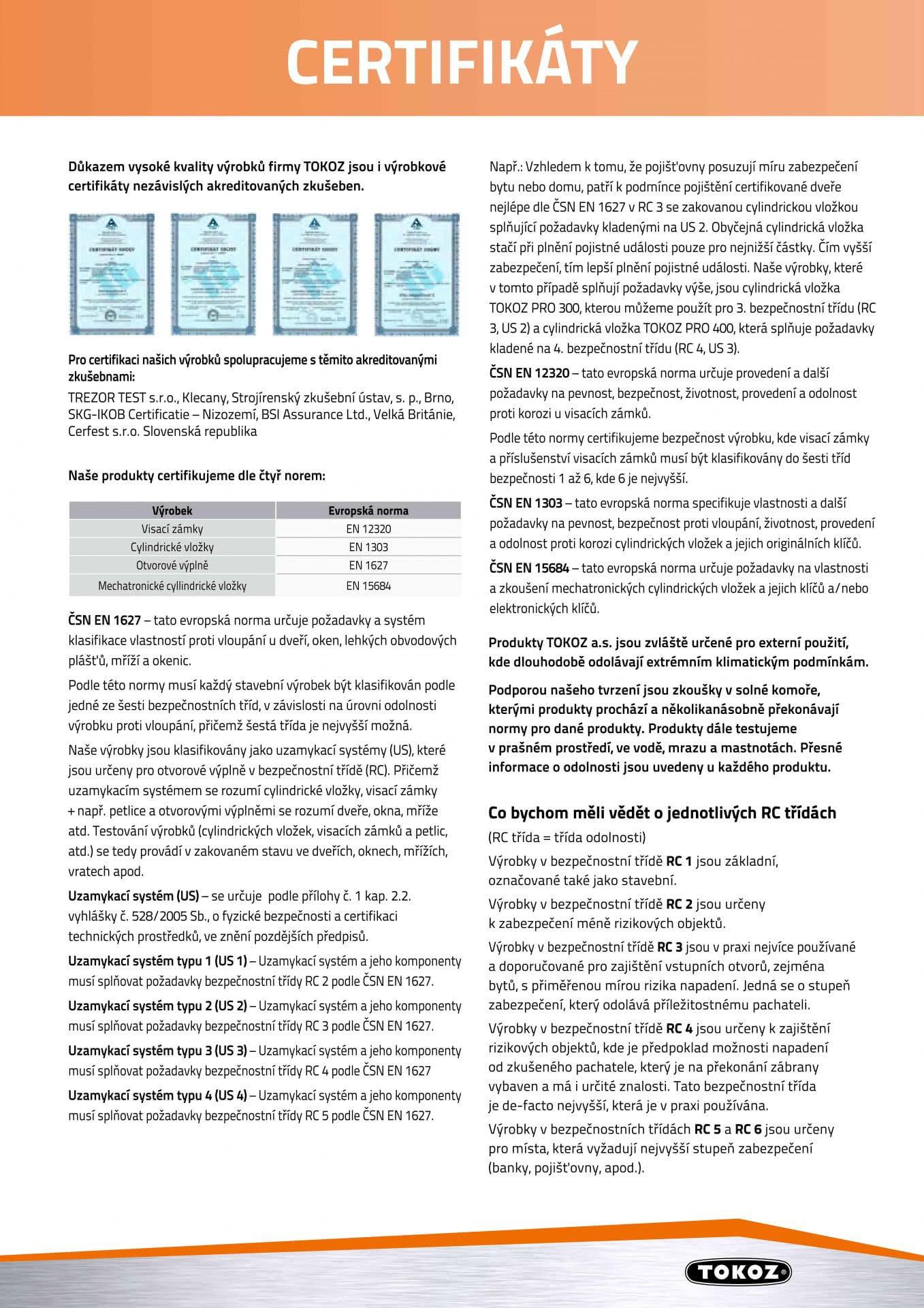 Pro certifikaci našich výrobků spolupracujeme s těmito akreditovanými zkušebnami: TREZOR TEST s.r.o., Klecany, Strojírenský zkušební ústav, s. p., Brno, SKG-IKOB Certificatie – Nizozemí, BSI Assurance Ltd., Velká Británie, Cerfest s.r.o. Slovenská republika